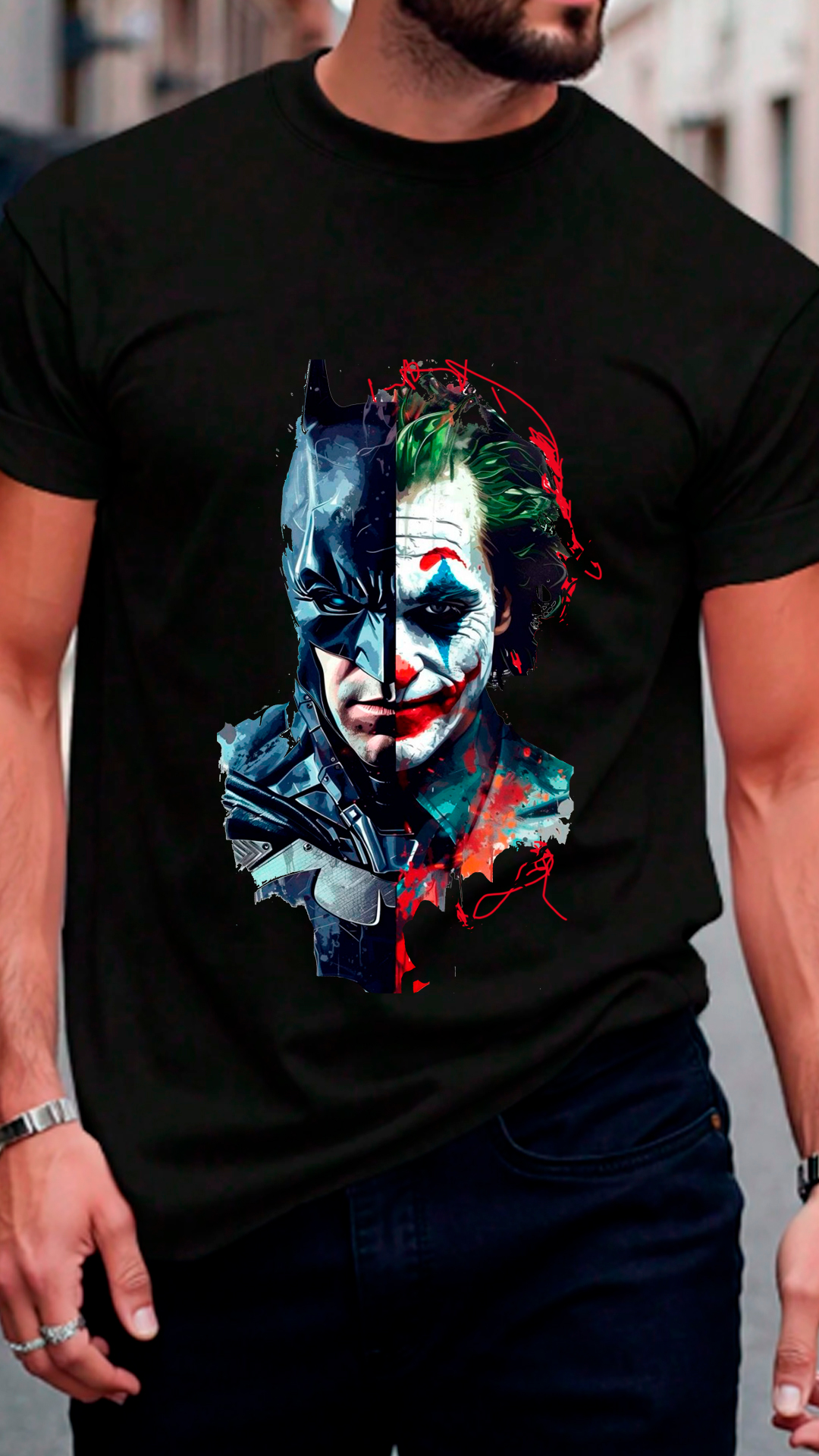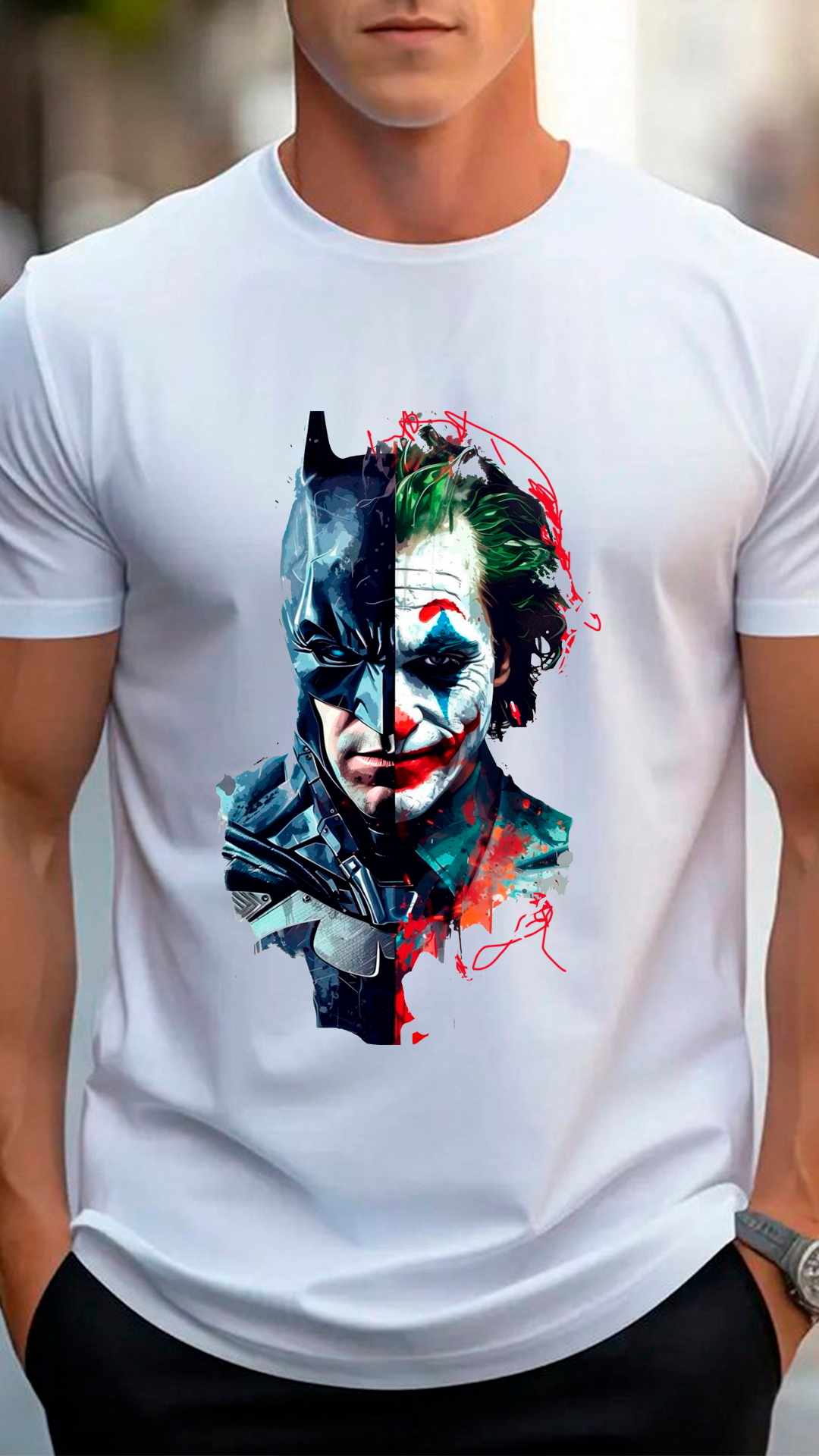 Remera blanca/ Negra con diseño impactante que fusiona a Batman y el Guasón en un solo rostro. La mitad muestra la máscara oscura del héroe y la otra mitad el maquillaje caótico del villano, creando un contraste visual poderoso. Estampado artístico en alta definición, con detalles de color y textura que resaltan. Perfecta para fanáticos del universo de DC y amantes de diseños llamativos y originales.