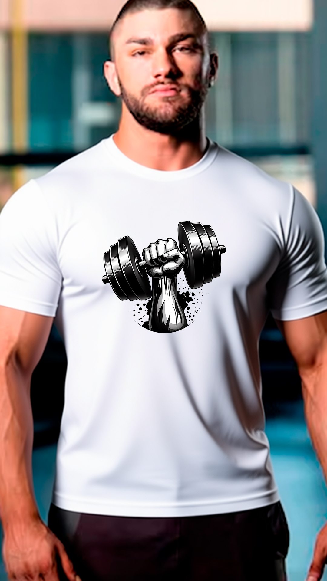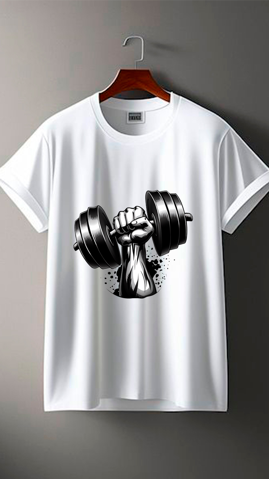 El diseño principal, ubicado en el centro del pecho, es una impresión en blanco y negro que muestra una mano musculosa sujetando una pesa (mancuerna) con firmeza