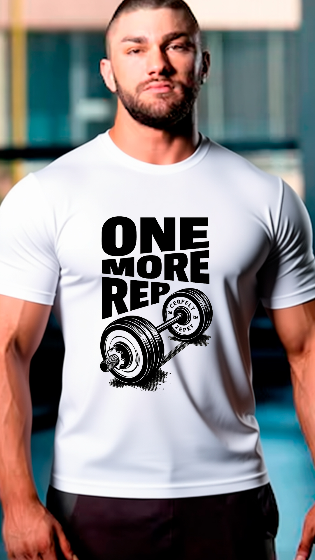 En la parte superior, en mayúsculas grandes y en una fuente audaz y gruesa, se lee la frase “ONE MORE REP” (Una repetición más).