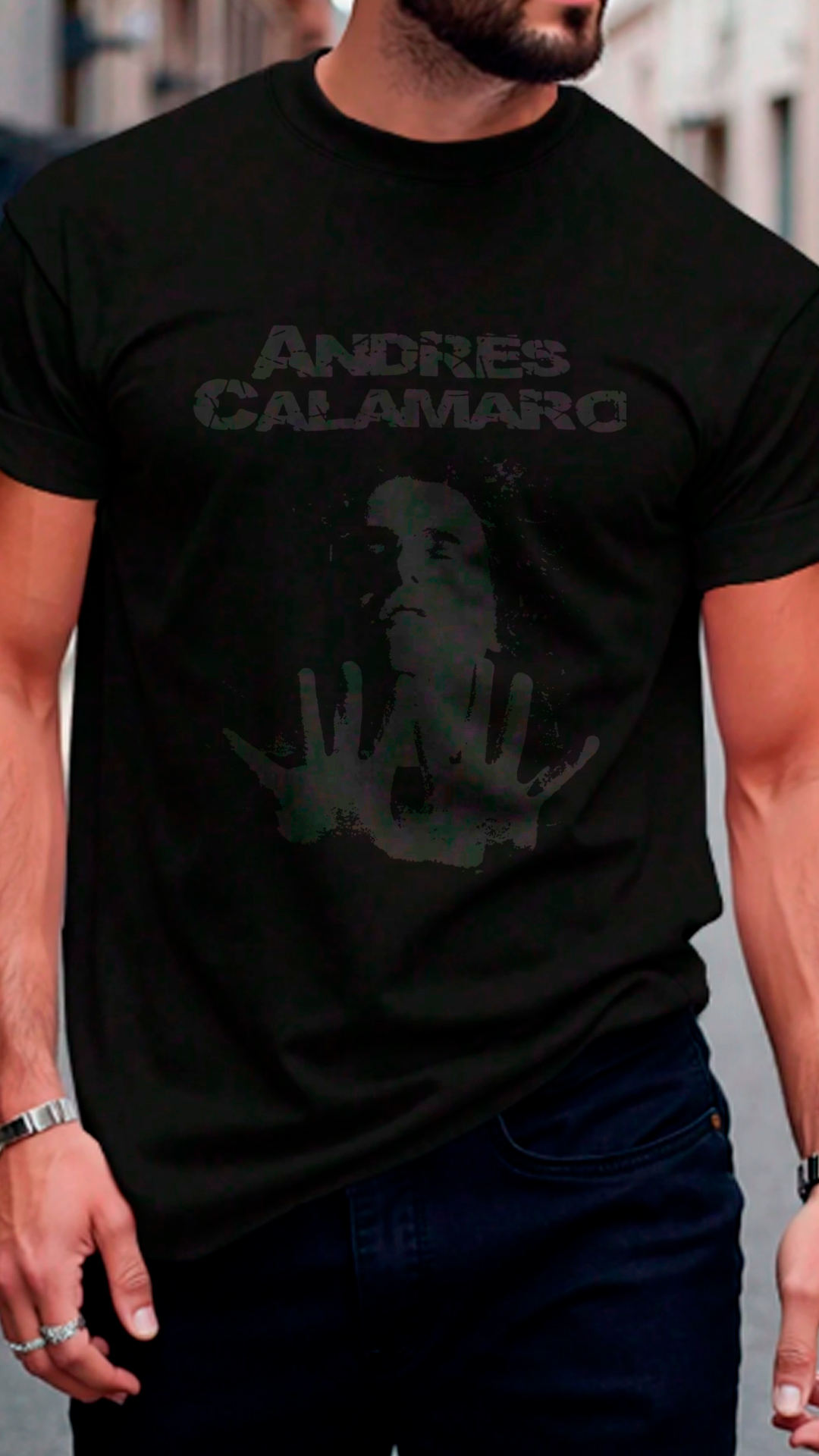 Remera negra estampada inspirada en Andrés Calamaro, ícono del rock argentino. El diseño presenta una gráfica sobria y artística con el nombre del músico y una imagen de estilo urbano, logrando un look intenso y auténtico. Confeccionada en tela suave y cómoda, ideal para uso diario, recitales o para quienes quieren llevar su pasión por la música en cada outfit. Una prenda clásica, versátil y con actitud rockera, pensada para verdaderos fans de Calamaro y del rock nacional