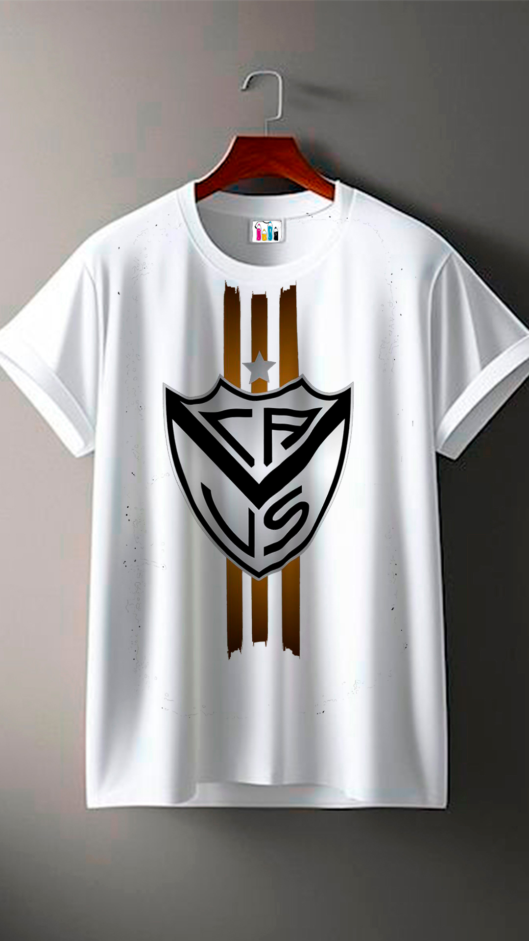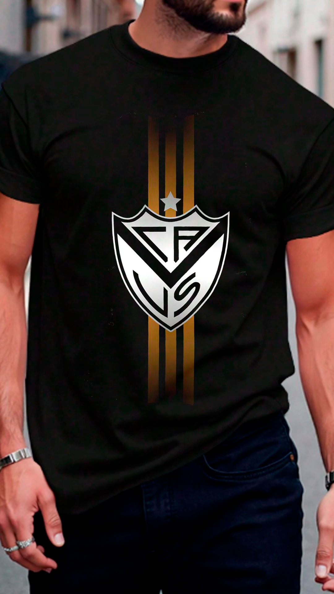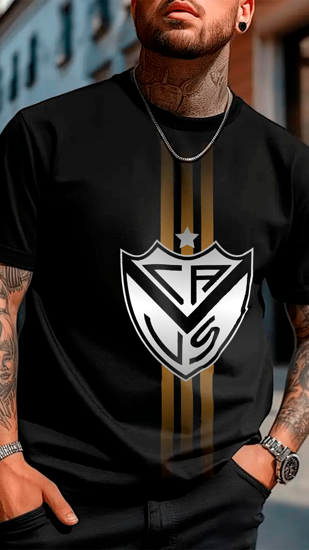 Remera negra de diseño urbano inspirada en Vélez Sarsfield. En el frente destaca una franja vertical central compuesta por tres líneas en tonos dorados, que aportan un estilo moderno y elegante. Sobre ellas se encuentra un escudo estilizado del club en blanco y negro, con un acabado metálico que resalta el contraste con el fondo oscuro. El diseño combina estética deportiva con un toque streetwear, ideal para hinchas que buscan una prenda distintiva y con presencia.