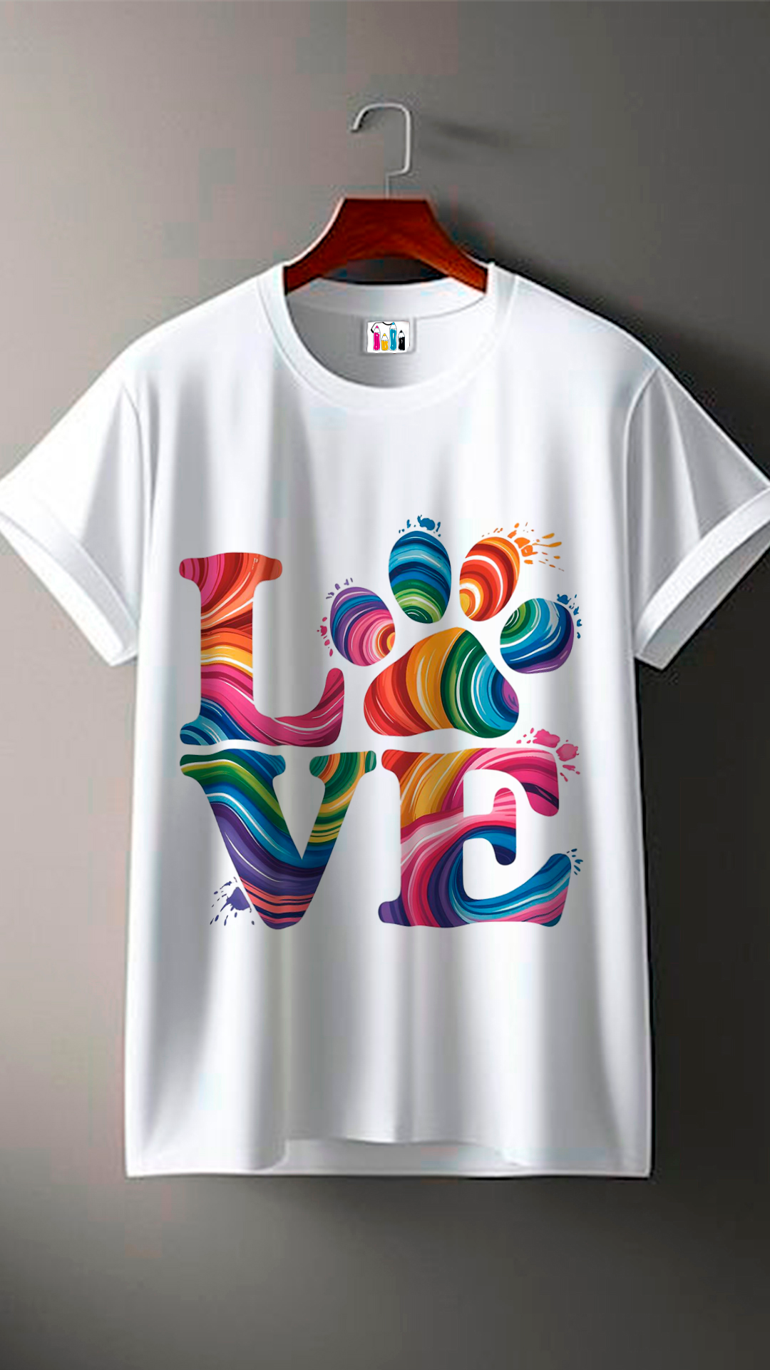 En resumen, es una remera blanca con un diseño gráfico colorido y expresivo que combina la palabra “LOVE” con una huella de pata, transmitiendo un mensaje de amor por los animales de compañía.