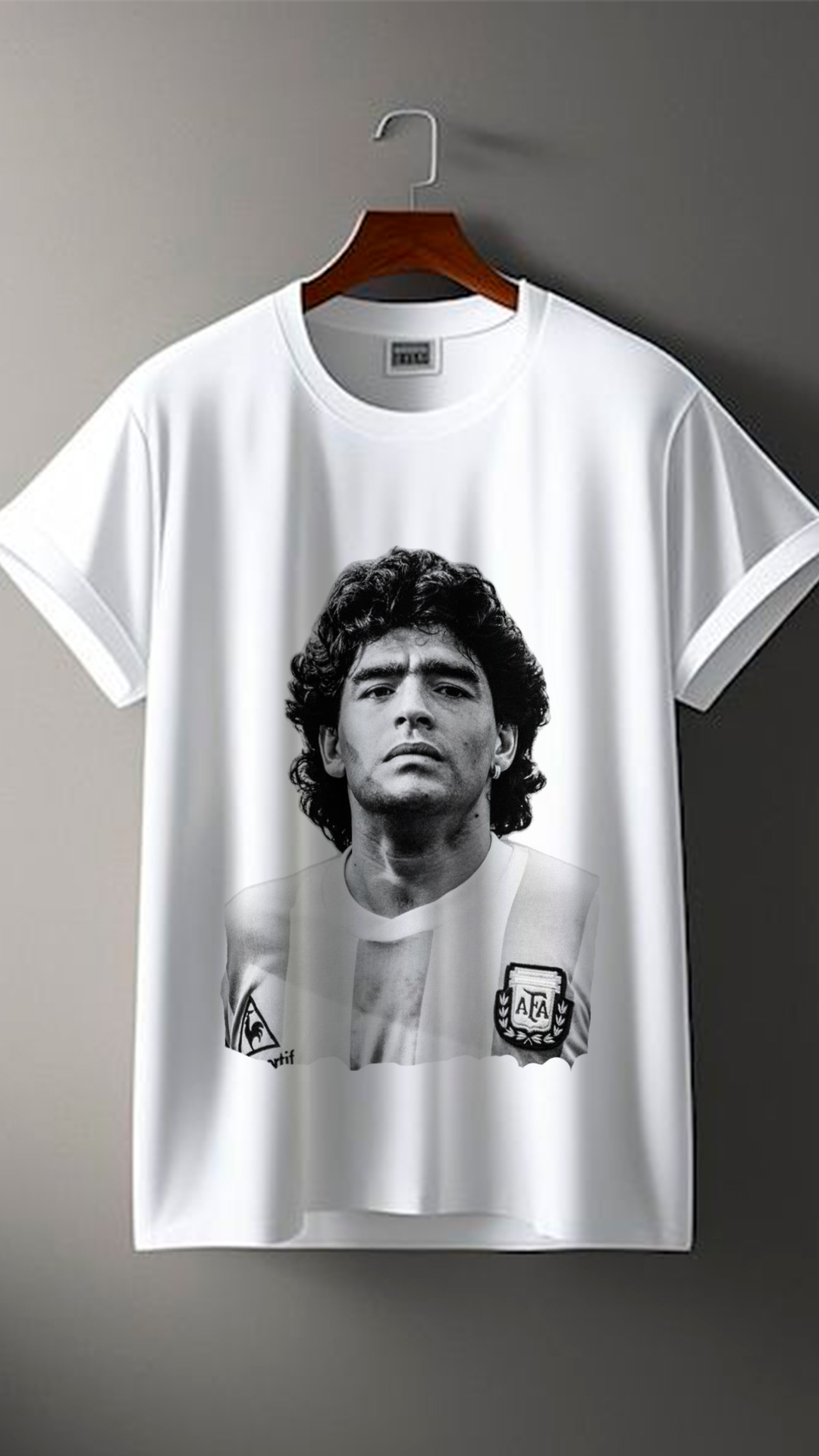 ¡Llevá a El Diez en tu pecho, donde todo comenzó! Esta remera presenta una imagen clásica en blanco y negro de Diego Armando Maradona, con su mirada intensa, su pelo característico y su alma de guerrero, luciendo la camiseta de la Selección Argentina —con el escudo de la AFA y el logo de Le Coq Sportif—, como símbolo de su legado mundial.