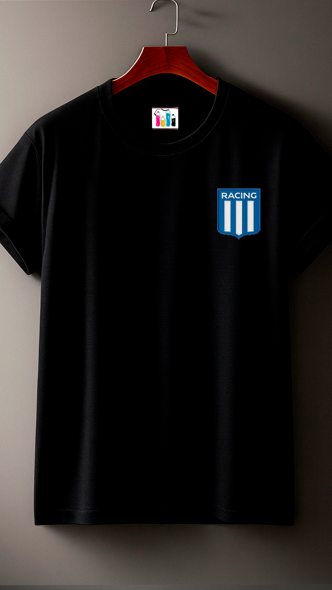 Elegancia y pasión en un solo diseño. Esta remera negra de corte clásico presenta el escudo oficial de Racing Club