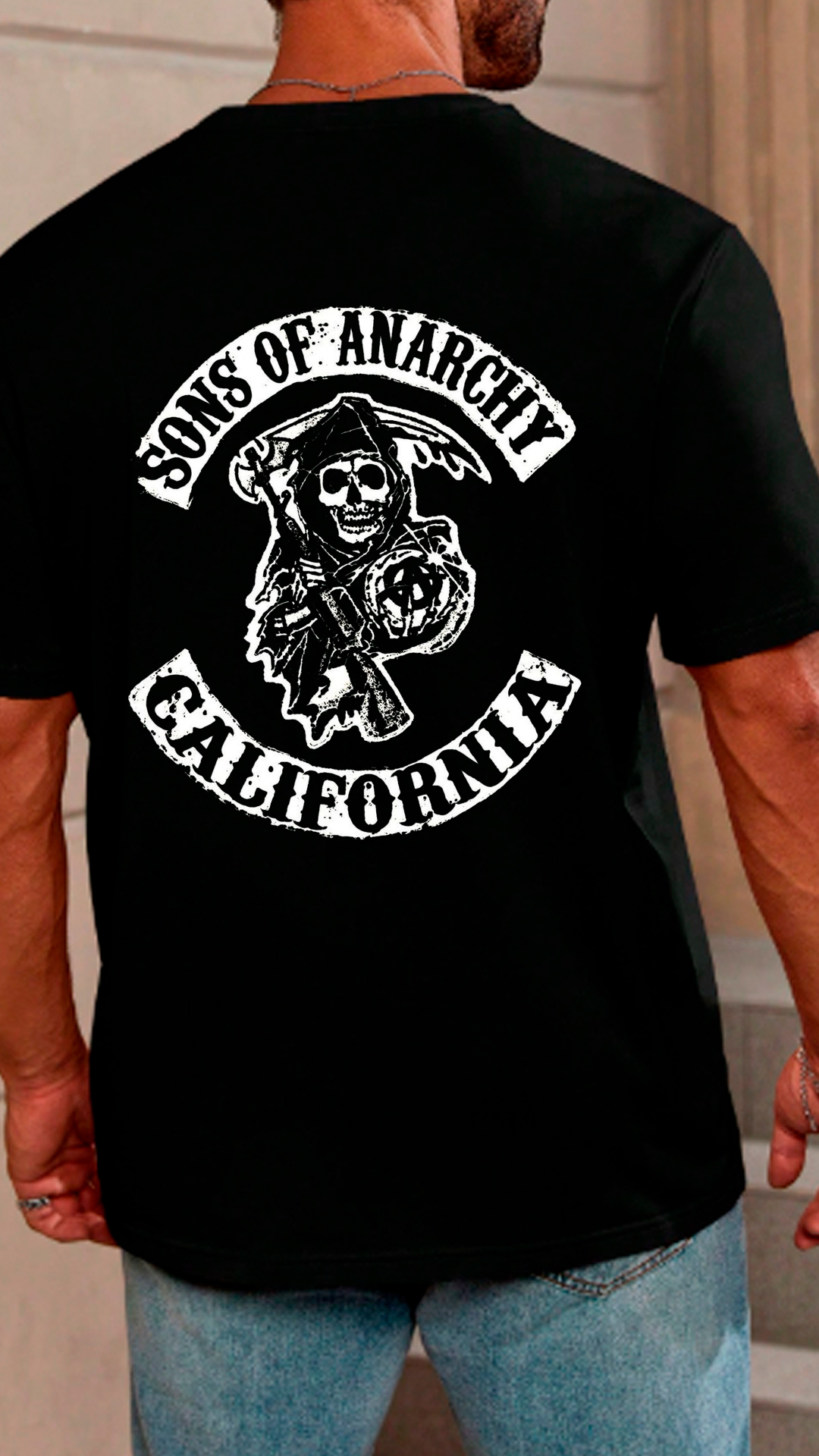 Remera de estilo biker inspirada en la icónica serie Sons of Anarchy. Presenta un impactante estampado en la espalda con el clásico emblema del club: la Parca armada y la leyenda “Sons of Anarchy California”, en contraste blanco sobre fondo negro, logrando un look fuerte y auténtico.