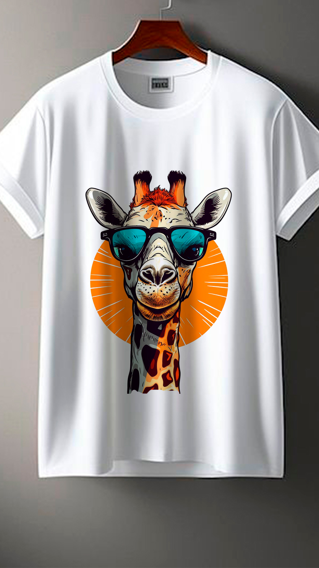 Remera negra con un diseño llamativo y moderno de una jirafa estilizada usando lentes de sol. La ilustración destaca por sus colores vibrantes, con detalles en tonos naranjas, amarillos y azul turquesa que contrastan perfectamente con el fondo oscuro. Ideal para quienes buscan un estilo original, divertido y con mucha personalidad.